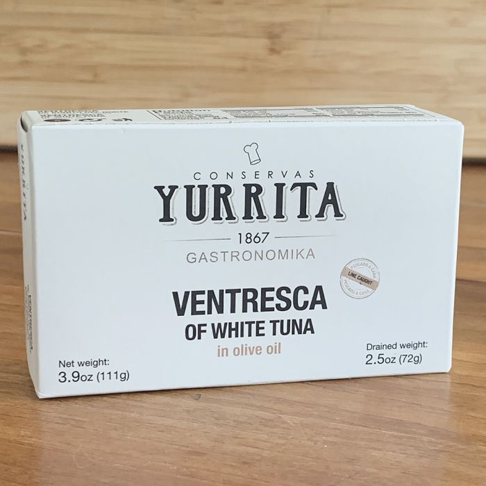 Ventresca is the triangular part of the albacore tuna's belly near the head. This area has a fine and fleshy texture and is considered a delicacy. Hand-packaged in olive oil. 3.9 oz tin (2.5 oz drained)